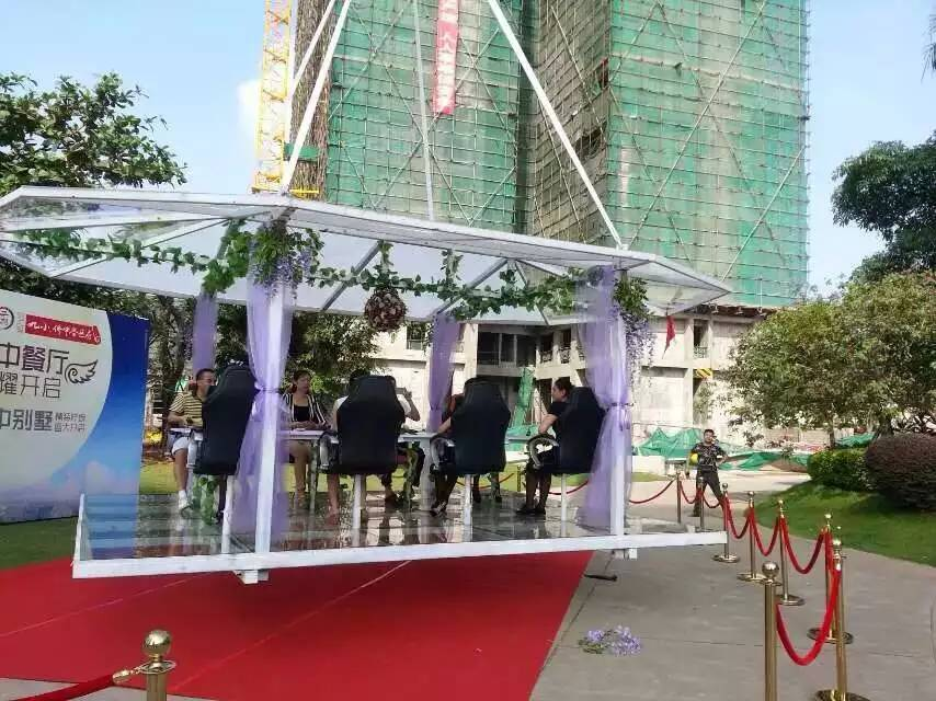 空中餐廳是能在高空就餐的餐廳。整個(gè)餐桌固定在金屬框架上,由一臺(tái)巨型起重機(jī)吊在30米左右高空。每次可接待8名顧客。除了享受美食之外,還可以俯瞰整個(gè)城市的美景。